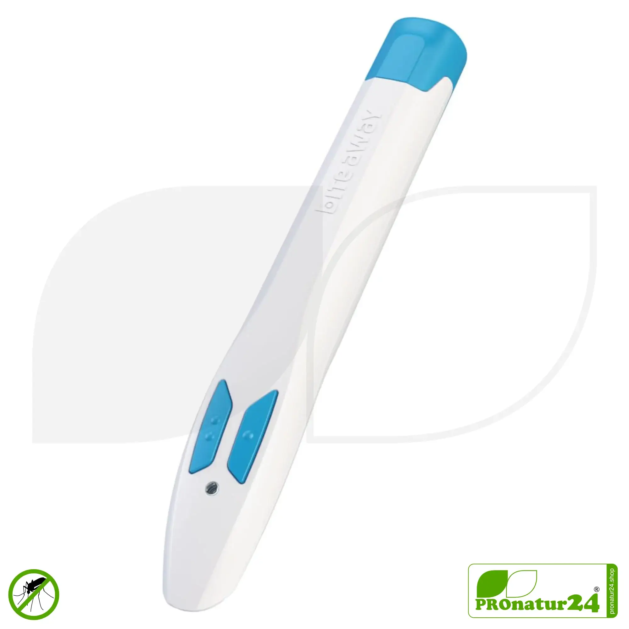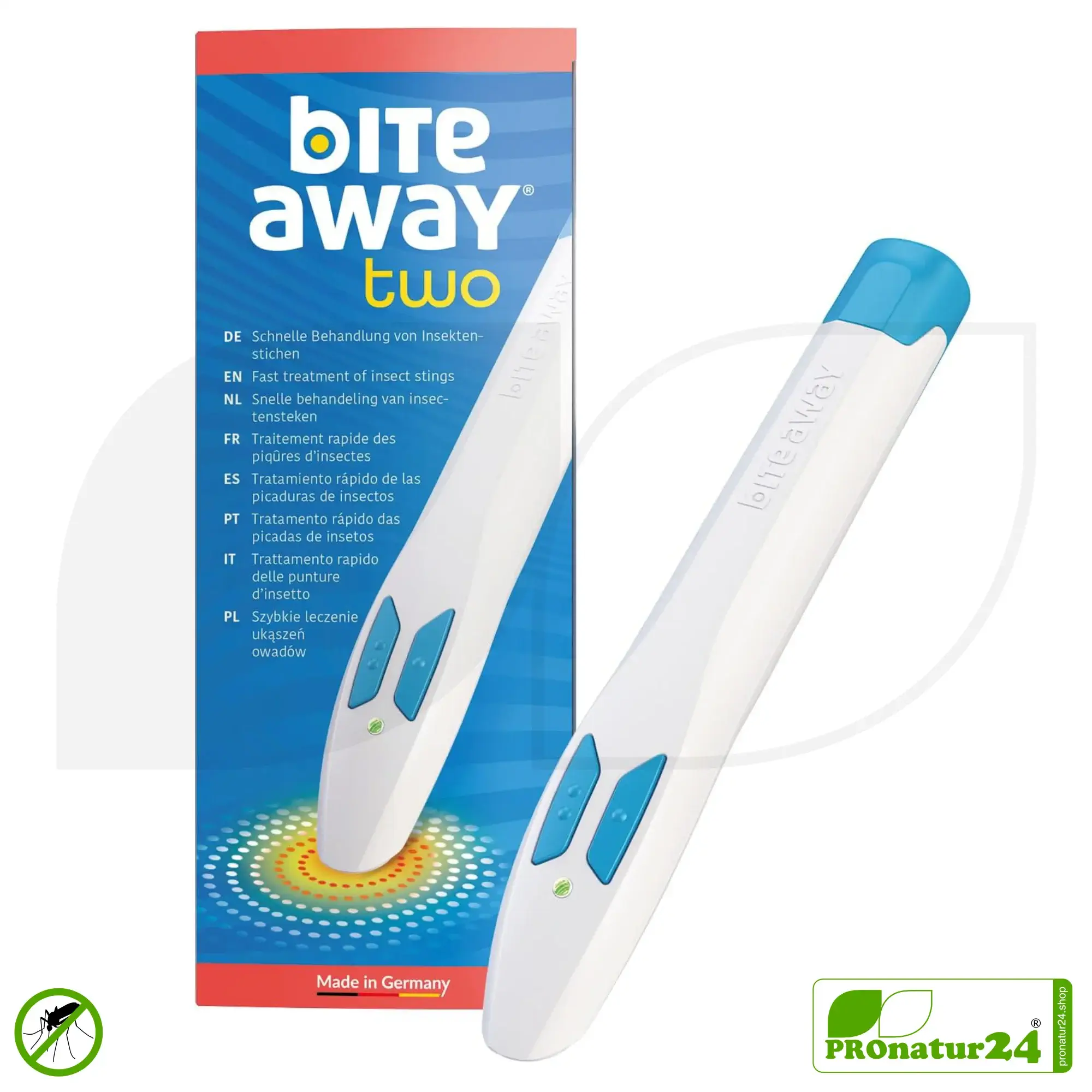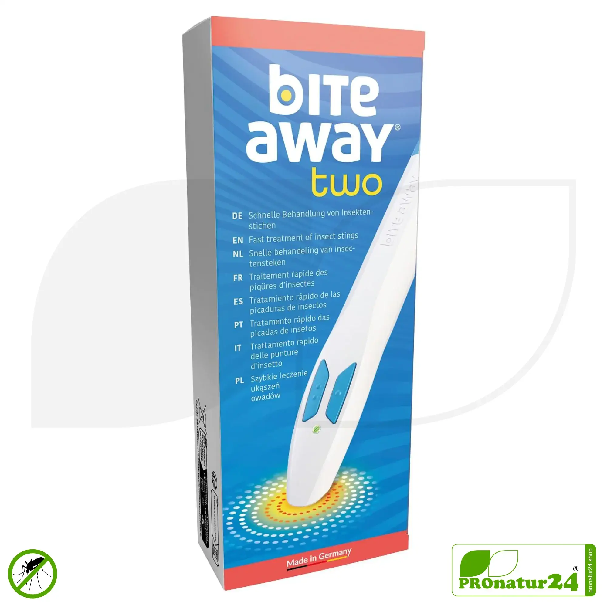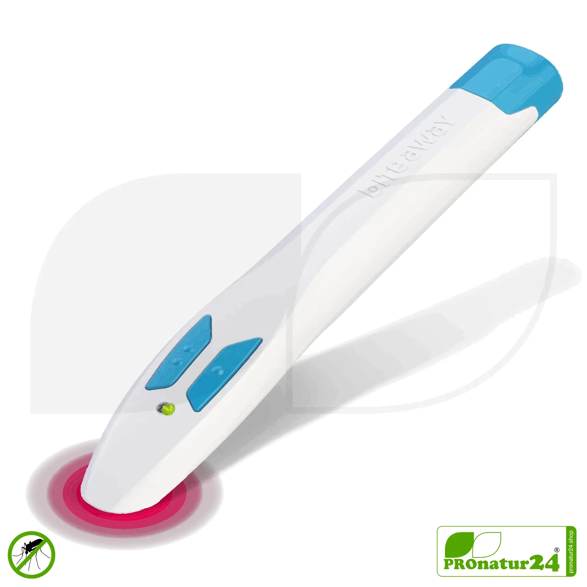 bite away® ist ein elektronisches Gerät, ein thermischer Stichheiler, das speziell zur Behandlung von Insektenstichen und -bissen entwickelt wurde. Es arbeitet ohne chemische Substanzen und basiert ausschließlich auf einem konzentrierten Wärmeimpuls, der als Thermotherapie bezeichnet wird. Durch die gezielte lokale Wärmeeinwirkung kann bite away® Schmerzen und Juckreiz nach einem Insektenstich schnell und langanhaltend lindern.