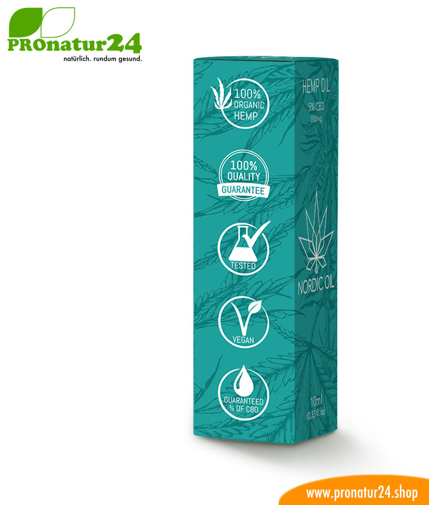 CBD Hanföl mit 5 Prozent Anteil an Cannabidiol ist die Light Variante, quasi für ein erstes Kennenlernen. Die Flasche enthält 300 Tropfen CBD, gewonnen von zertifiziertem weiblichem Hanf. Der Anbau der Cannabis Pflanzen findet kontrolliert und zu 100% biologisch in Skandinavien statt. Die Produktion ist vegan, frei von Gentechnik, chemischen Düngungsmitteln, usw..