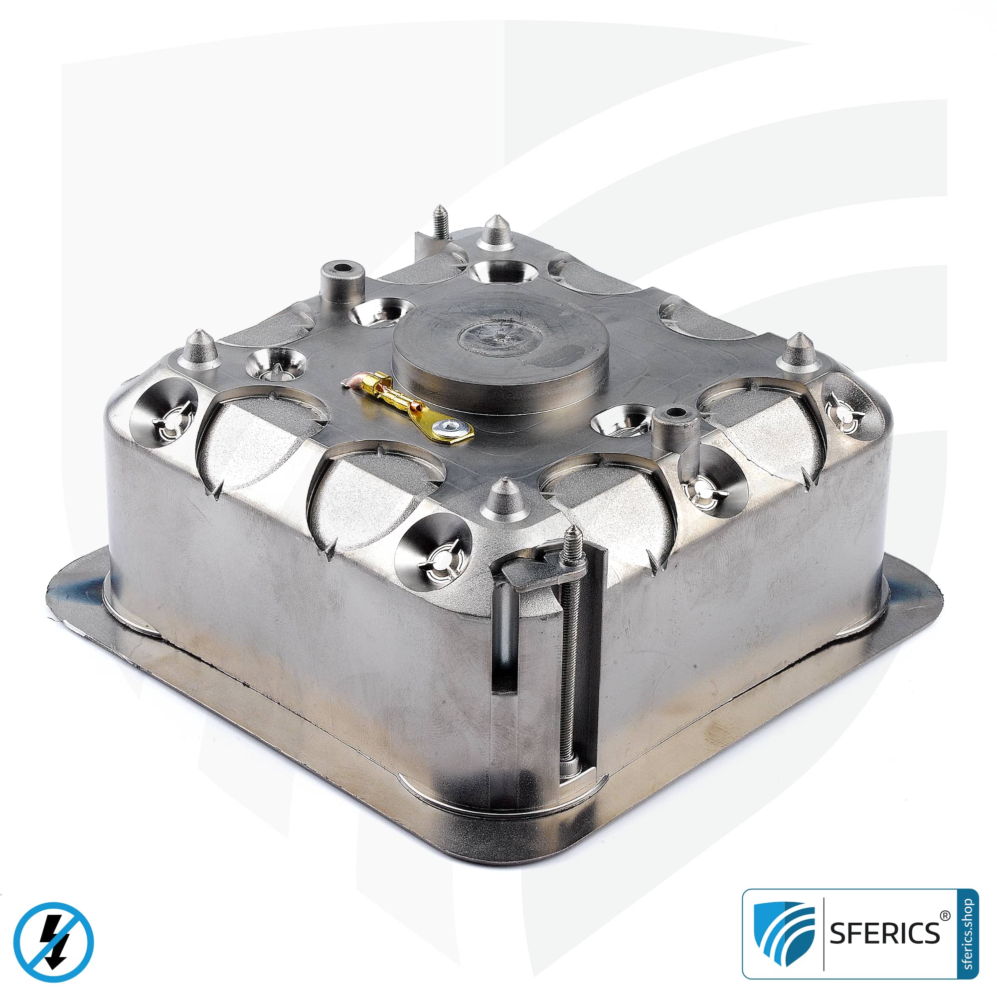 Dieser geschirmte Abzweigkasten bzw. Verbindungskasten wird zur Reduktion niederfrequenter elektrischer Wechselfelder verwendet. Dies ist eine idealer Ergänzung zur mittels Abschirmfarbe geschirmten Wand um auch das “Loch Steckdose” im farradayschen Käfig bestmöglich zu schließen.