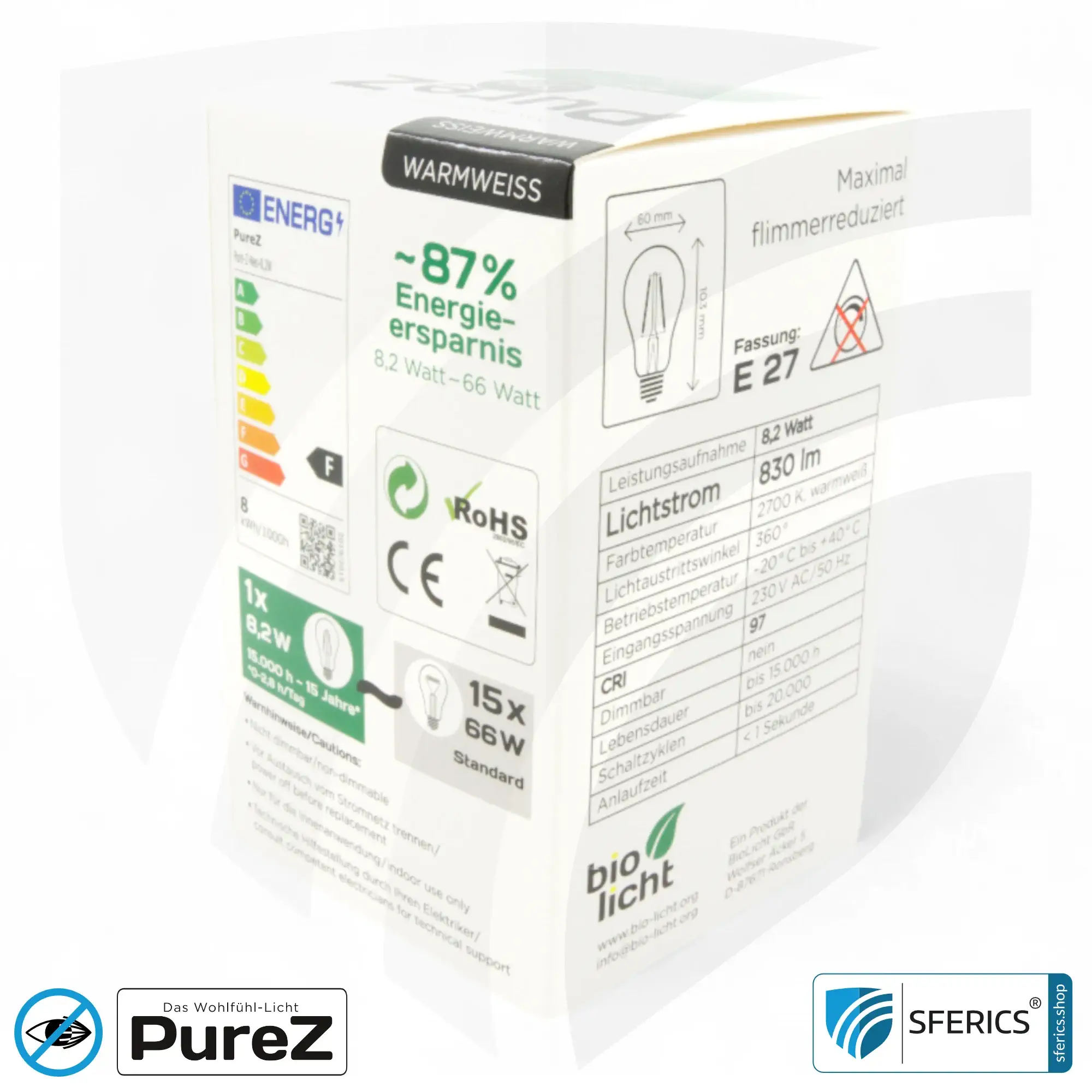 - 8,2 Watt (entspricht der Lichtleistung einer 60 Watt Glühbirne)